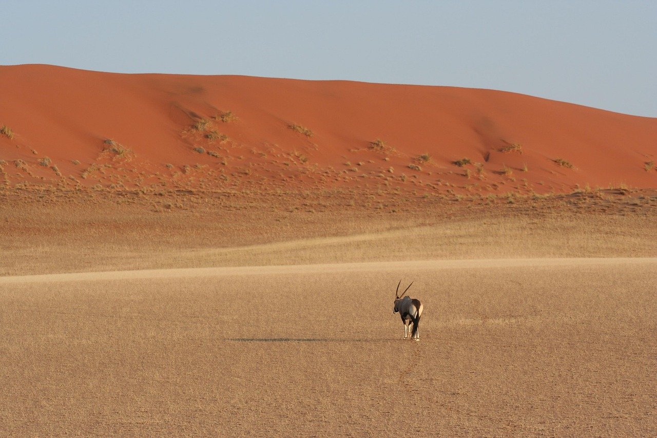 El paisaje más emblemático de Namibia: imponentes dunas de color rojo óxido, marismas blancas y cielos azules infinitos.